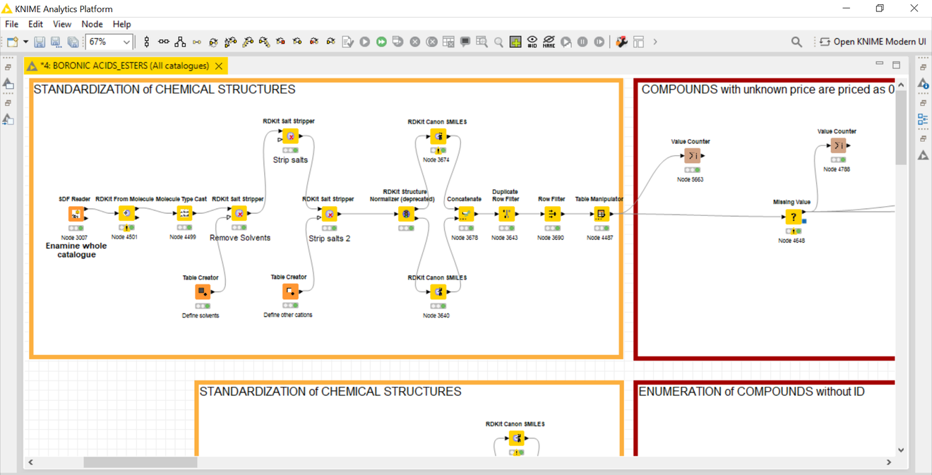 To prepare our libraries we initially collected around 650 mono- and bi-functional chemically diverse building blocks that would allow us to utilise them interchangeably among several DELs. The diversity of libraries is driven by the structural diversity of the building blocks used for library synthesis, considering simple 2D similarity (e.g. Tanimoto distance) alongside variations in ionisation, lipophilicity, hydrogen bonding potential and conformational limitations/preferences. To carry out this selection we used KNIME, a data analysis platform, to help us choose building blocks with the purpose of maximising the coverage of chemical space. The building blocks were sourced from in-house chemical stock at The University of Manchester and Newcastle University, from a donation from GlaxoSmithKline and the Enamine's in-stock-catalogue.